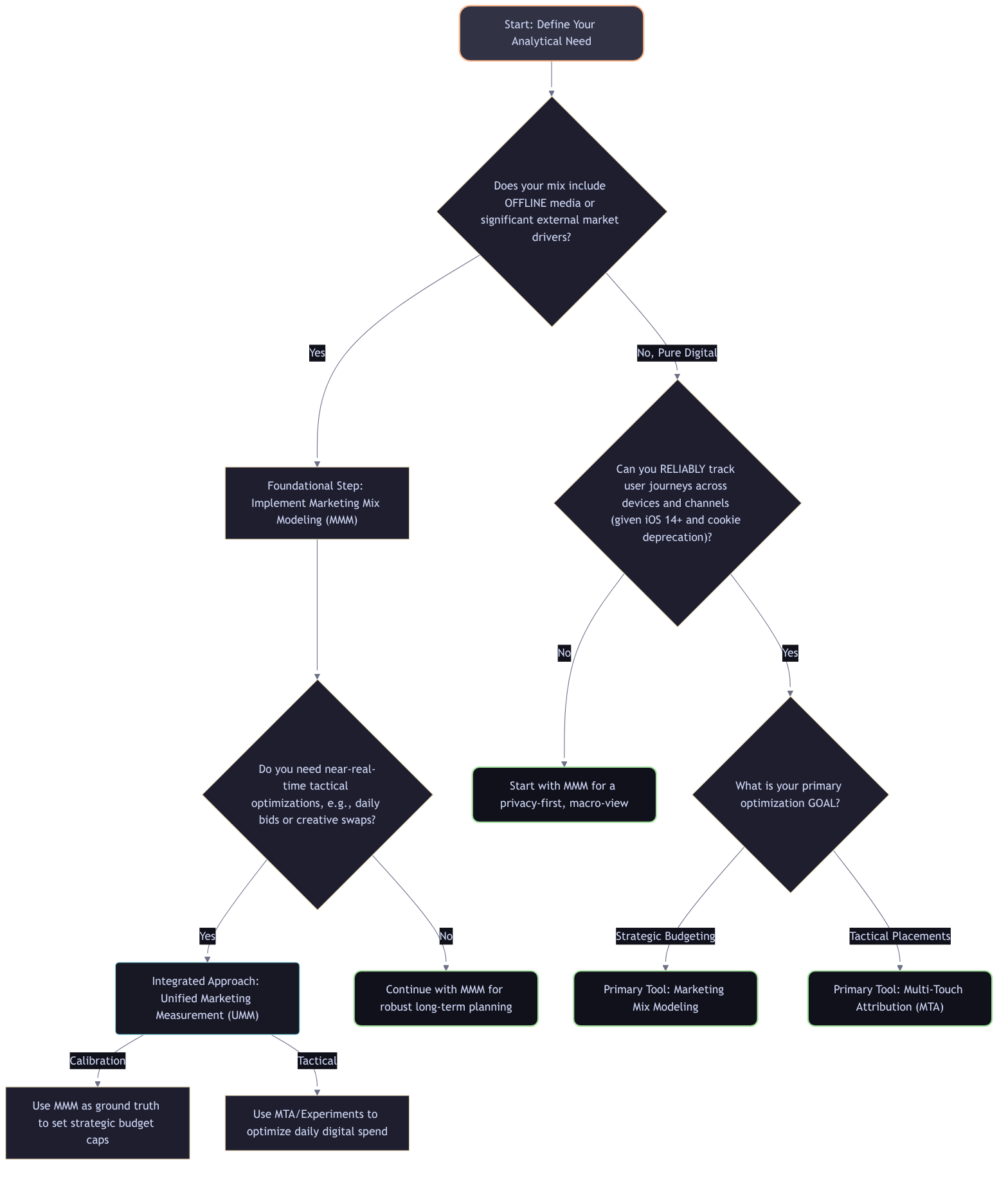 Choosing between MMM and MTA depends on your business model and your data maturity. If you are a direct-to-consumer brand with a heavy offline presence, MMM is non-negotiable. If you are a pure-play SaaS company with a short sales cycle, MTA might still provide significant tactical value.